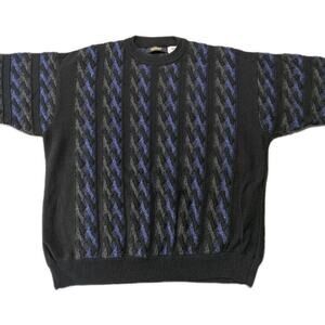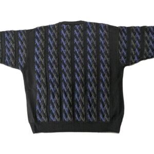 Vintage Bachrach men's sweater in a bold, Coogi-style 3D textured knit. Features black, blue, and gray woven design with a luxurious merino wool blend. Made in Italy, tagged size XL (EU 54). This heavyweight pullover is perfect for statement styling with premium craftsmanship and eye-catching detail. A rare retro piece for collectors and fashion enthusiasts alike.