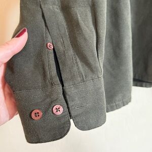 Super soft material. Looks micro ribbed, almost like corduroy. Thicker shirt, can be worn like a very lightweight jacket layer in cooler weather, or for casual, business casual wear. Forest green, dark green color.