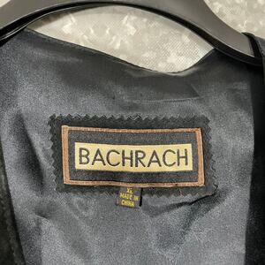 Men's vintage leather vest by Bachrach from the 1990's. This black western or biker style vest has a sueded leather front with a nylon back, button front, and front pockets. It is 100% leather with a nylon acetate lining and back.
