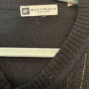 This is a preowned Bachrach sweater. It has a small pull in the wool. No holes stains or flaws. It has a striped texture weave and is a unique vintage style with a v neck.