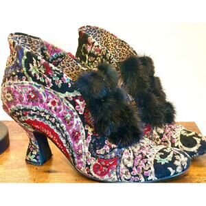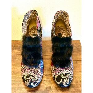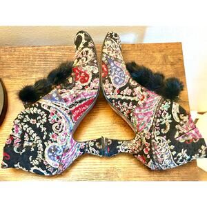 Baci "Daisy" Victorian-style brocade and mink pompons ankle boot heels Size 10