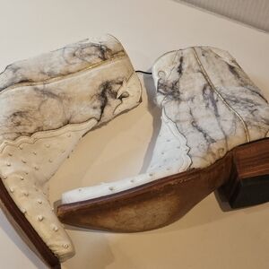 Back At The Ranch White Marble Ostrich Zipper Ankle Cowboy Boots