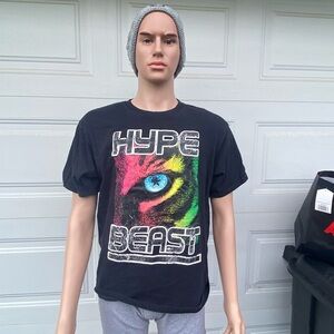 Black t-shirt with vibrant graphic design. Features bold 'Hype Beast' text and colorful eye detail.