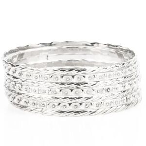 Embossed in slanted ribbons of textured and studded hammered patterns, trios of mismatched silver bangles stack across the wrist for an intense industrial vibe.