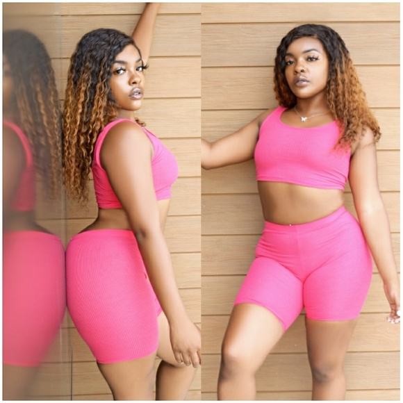 A ribbed knit solid set featuring a sleeveless cropped top with a round neckline. as well as a pair of shorts with a waist band. 92% Polyester 8% Spandex