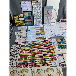 Comprehensive scrapbooking kit with various themed stickers, labels, and papers. Ideal for creating personalized back-to-school projects and memory books.