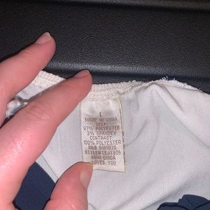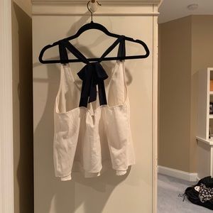 This is a high quality fashionable shirt in a size L bought from Nordstrom’s. It is mainly polyester and feels very nice on the skin. The bow is very cute and fashionable. I personally love this shirt. There is a make up stain on it so If needed I will decrease price.