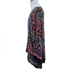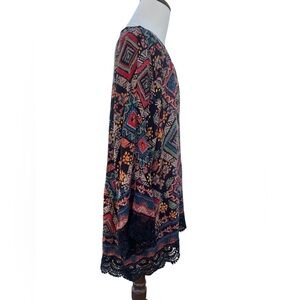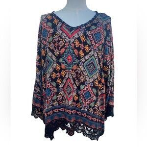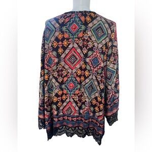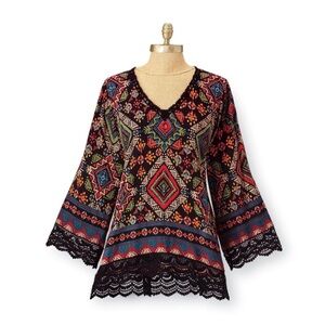 Measurements length in the front from top to bottom is 22 inches the back top to bottom is 29 inches pit pit 27 inches sleeves neck to end of sleeve is 27 inches. Distinctive and colorful diamond-print tunic is finished with crochet lace at the V-neck, long sleeves and hem.