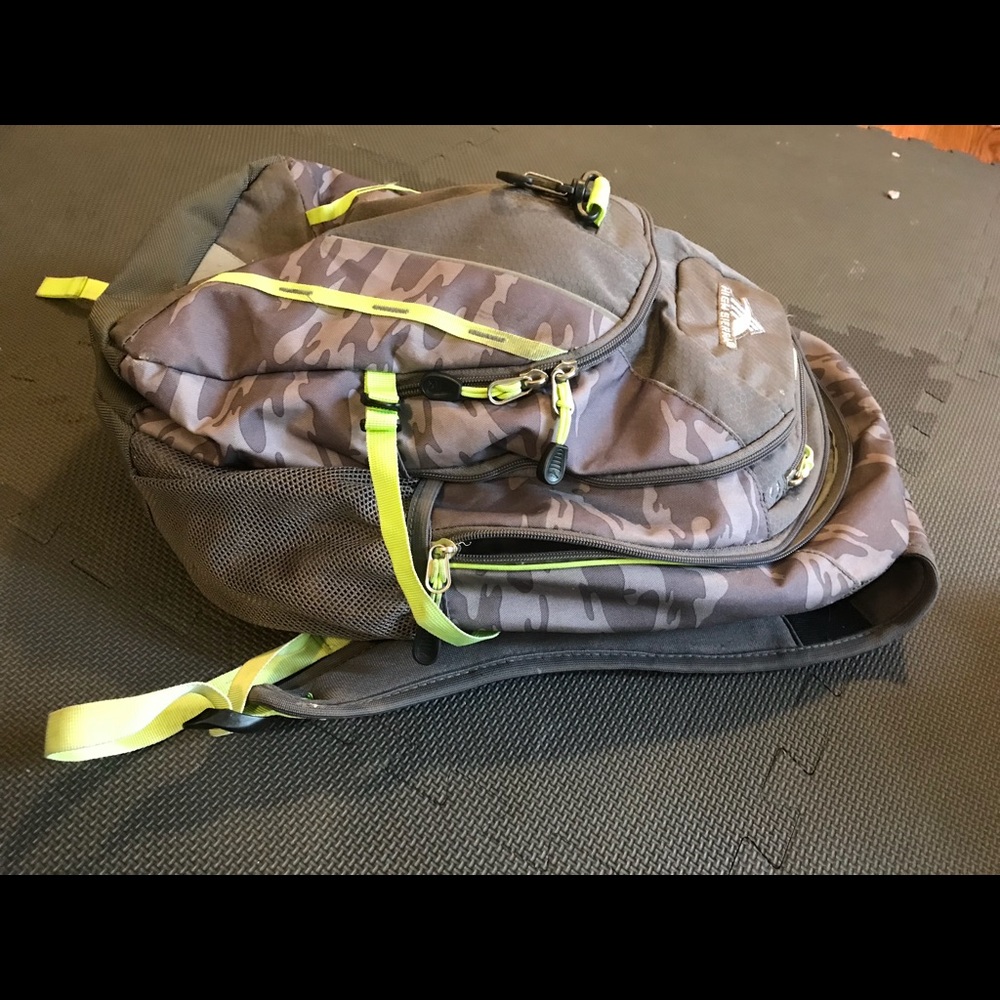 Back pack Computer pocket Phone carrier pocket 2 water bottle pocket Gray neon yellow camo