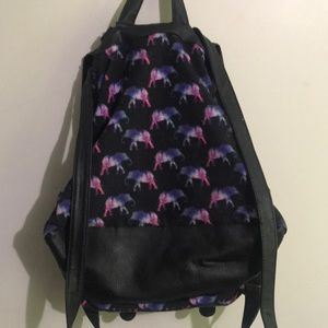 Smaller black back pack with purple/pink elephants. Small front pocket, main pocket with adjustable straps.