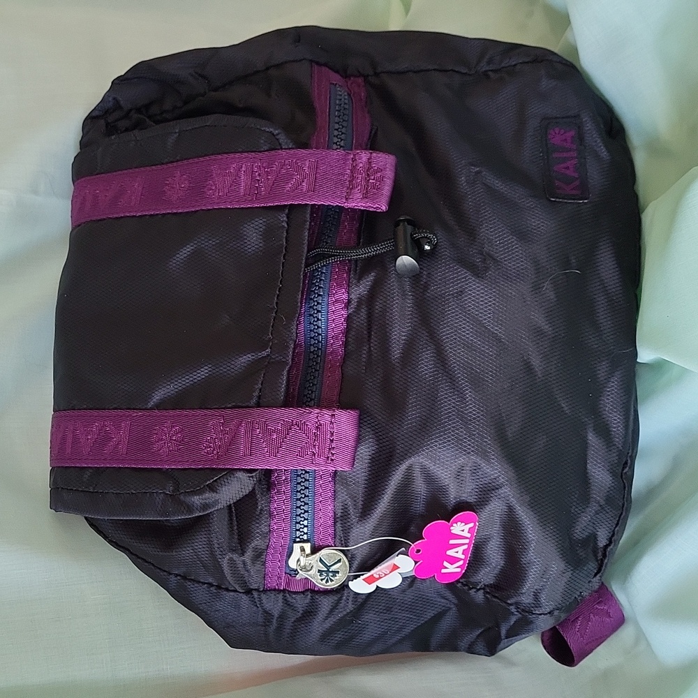 Soft back pack 11 1/2" high, 10 1/2' wide and 4 1/2" deep. Purple strapping, front zippered pocket, zippered pocket inside plus two small unzippered pockets inside as well. It closes with a cord and toggle and flap has a small Velcro flower to keep it shut.