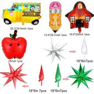Back to School Party Decorations Packaging Include:132pcs latex balloon(red, orange, yellow, green, dark blue, fruit green),1pcs school bus foil balloon, 1pcs school is cool foil balloon,1pcs apple foil balloon,1pcs pencil foil balloon,21pcs 18*5.9in cone foil balloons,1 pcs balloon chain(16ft) and 1 roll of balloon glue dots.
