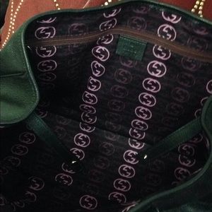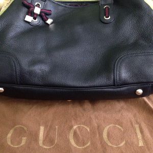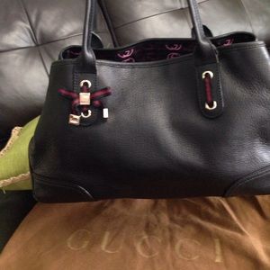 Authentic leather Gucci bag, very soft, color black with attached red and black ribbon with Gucci sign. Small minor scratch at the corner bottom of the bag. Barely noticeable. Very clean inside and out. Used a couple of times only. Comes with the gucci fabric bag. No receipt. I bought it a long time ago in California.