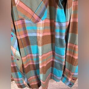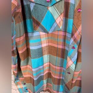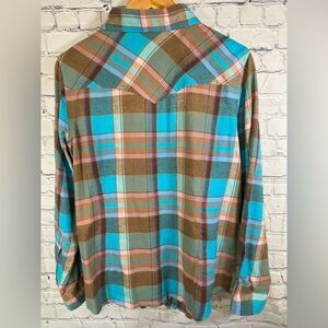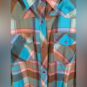 Back In The Saddle Teal Brown Purple Plaid Western Cowgirl Snap Button Shirt M