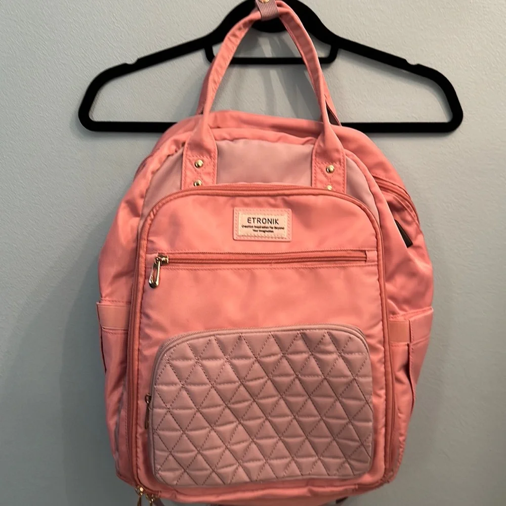 A cute back to school, electronic backpack, with three compartments to side holders and a black access pole through charging adapter.