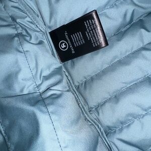Backcountry collaborative product jacket with NAC logo on chest size M product shows a womens blue Backcountry puffer jacket with a hood, featuring the logo of the National Ability Center (NAC) on the chest and the "Backcountry" logo near the bottom hem. The jacket is zipped up and laid flat on a patterned rug. The NAC, whose logo is visible on the jacket, is an organization that provides adaptive recreation and outdoor adventures for individuals with disabilities. Backcountry is a retailer that partners with the NAC. The jacket appears to be a collaborative product or promotional item between the two organizations.