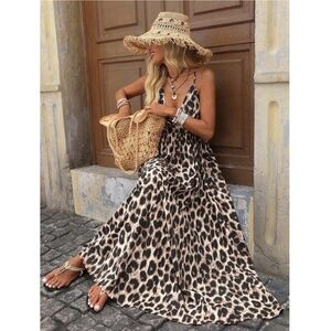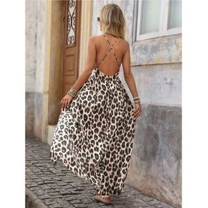 Backless Cheetah Maxi Dress Criss Cross V-Neck