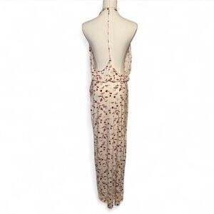 Chic backless dress with a halter neckline. Cream base with red accents. Perfect for stylish outings.