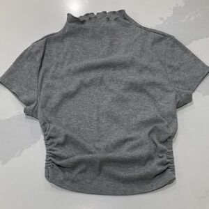 Chic heather gray top with ruched detailing. Short sleeves and drawstring accent.