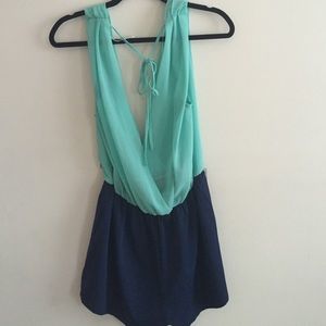 Teal with navy blue shorts! Front and back are both low cut, and the back ties together! SUPER comfortable, and size very adjustable!