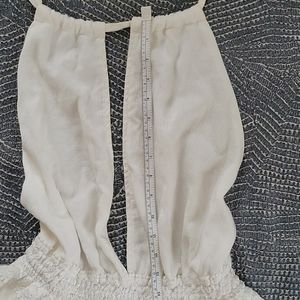 Gauze like and lined. Looks like a mini dress but is actually a romper..would love it if I didn't have short girl issues 🤷🏻♀️ totally backless. It's a Med but I think the elastic waist (wider band and stretchy) runs a bit small.