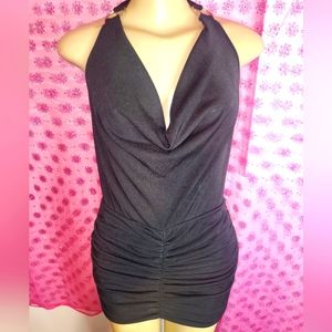 Short rouched party dress. Has backless detail and neck tie around. Fits very close to body, material has lots of stretch. Rouching accentuates hips and butt area.