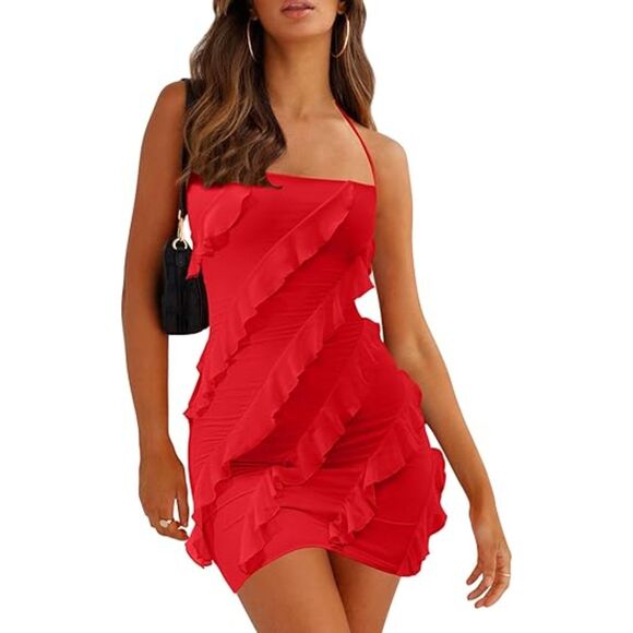 These halter party dresses for women feature charming ruffles, a sleeveless and backless design with spaghetti straps, a solid color palette, a bodycon fit, and a mini length, making them perfect for making a bold and elegant statement at any special occasion.