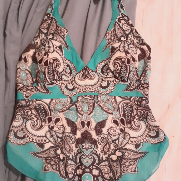 Tiffany blue and black, around-the-neck tie and backless.