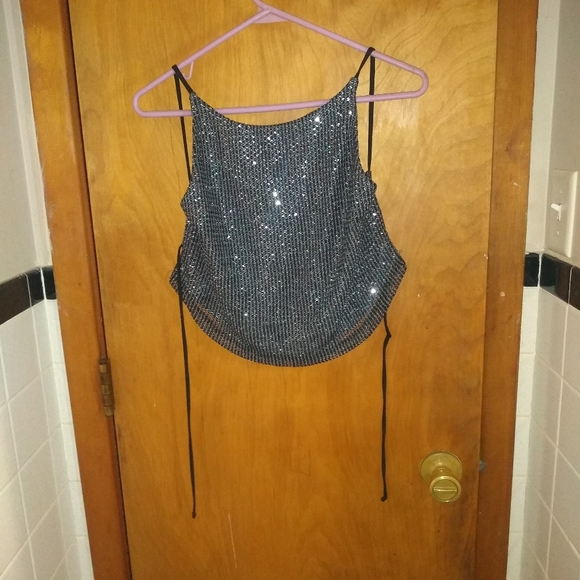 Backless/tie back top with sparkles. No size tag but fits size small-medium