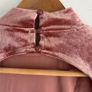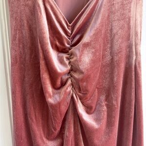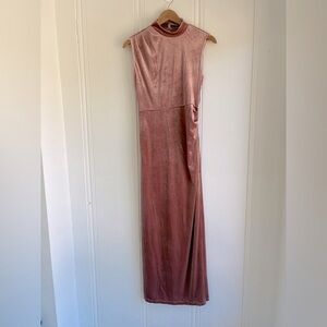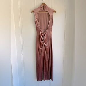 Perfect for any occasion, elegant design and soft fabric ensure a flattering fit. Halter button neck, backless, ruched, back slit. Beautiful soft warm pink color. Also available in blue.