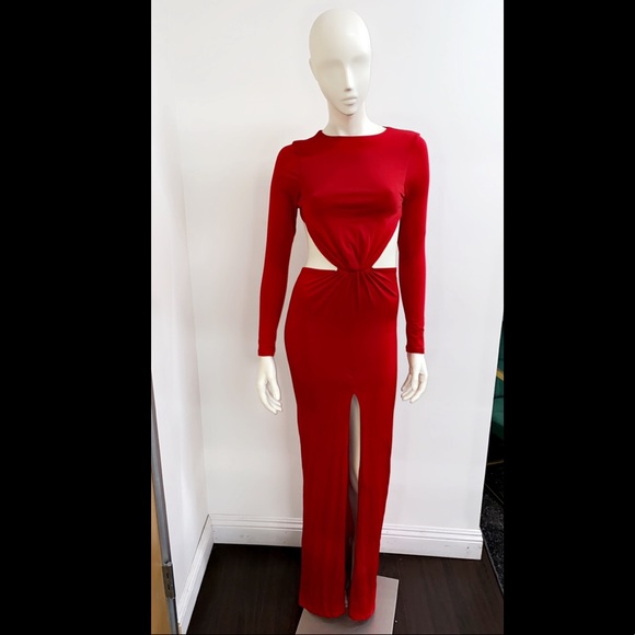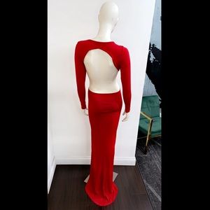 Red backless gown, long sleeves. The front has a center slit. This fabric has stretch.