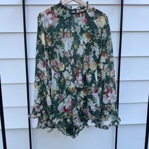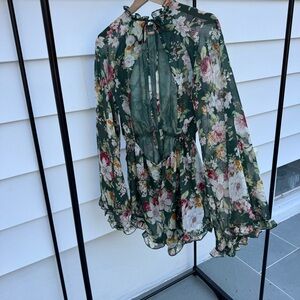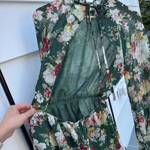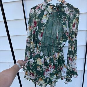 Beautiful and comfy long sleeve backless romper. The sleeves are sheer so it’s a great option for spring summer and fall. Dress it up or wear it casual. Size small but it’s loose fitting and has elastic so it would also work for people who wear medium. Worn once