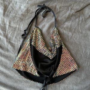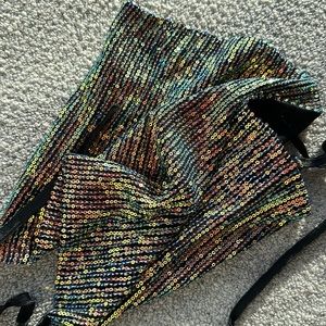 Backless sequin top String ties for around your neck and behind your back Has a little slouch by your breast line
