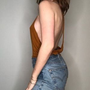 Backless halter tank top in tan. Braided strap down the back. Suppeeeerrrr sexy