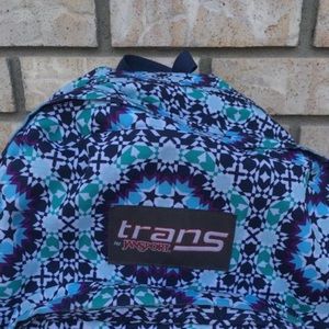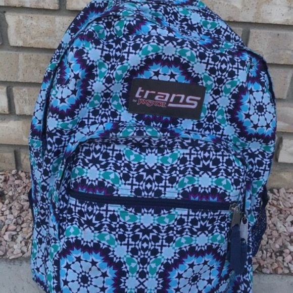 It has blue, purple, white on the backpack, with all sorts of fun patterns! It is from Transport and it has 4 pockets, 2 that fits a laptop, and 2 smaller ones