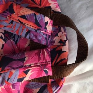 colors: pinks, oranges, blues, purples, corals on outside & navy blue on inside.