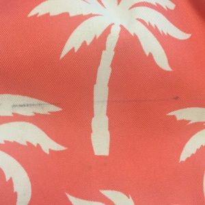 Salmon colored with cute white palm trees. Only used a couple of times. The end of one strap is a little frayed and there’s a couple of spots on the bottom and front as shown in pics.