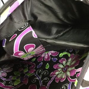 A vera Bradley backpack it is brown pink lime green and black and has slots on the inside is well on the outside it has zippers it goes on your back