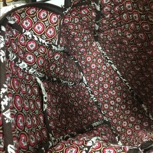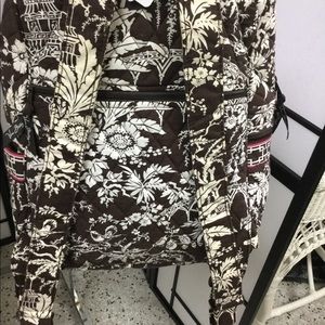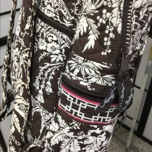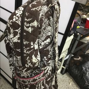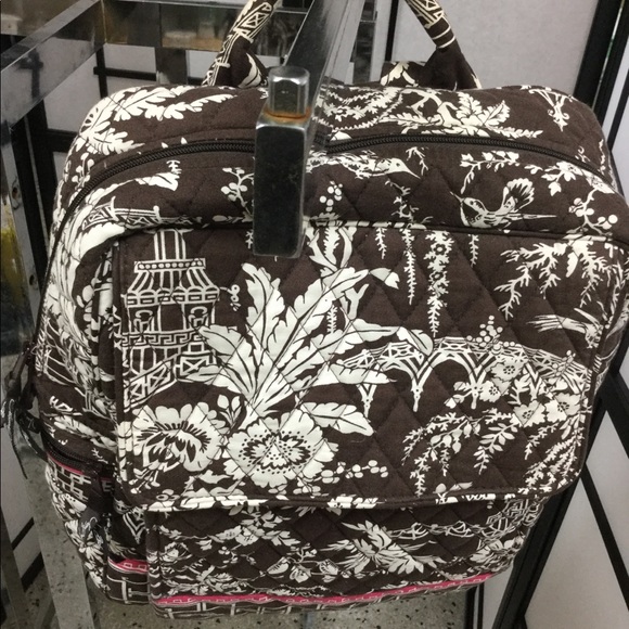It is a vera Bradley backpack and has pockets on the outside zipper’s character on your back and has a lot of compartments it is brown pink and a touch of green