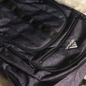 Dark grey backpack. Secure soft pocket for laptop. 3 large pockets. 2 small pockets in front. 2 pockets for water bottles (left and righty). No broken zippers. Padded to allow comfort for your back. 2 light reflectors on back for night time.
