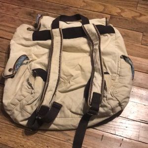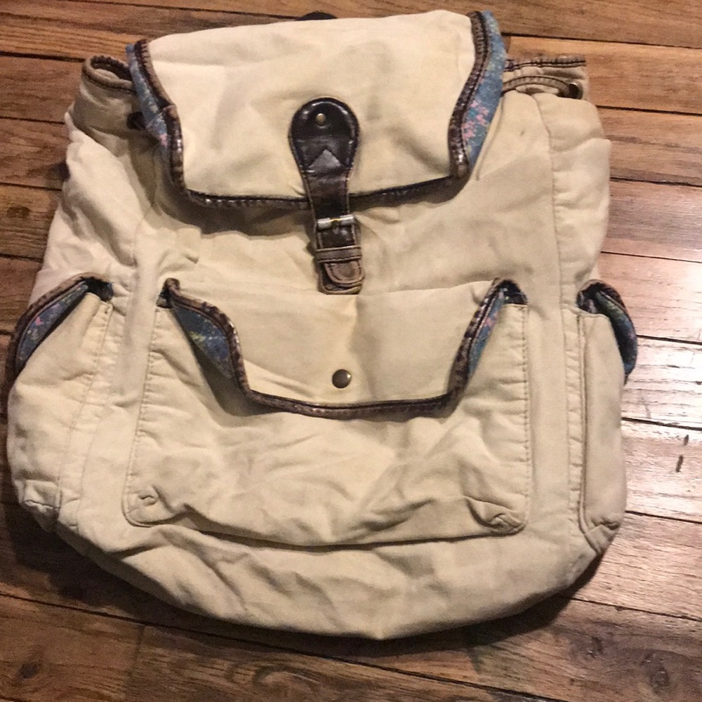 Beige backpack with a floral inside. Perfect for a getaway weekend or for light supplies. Has a front pocket, two side ones, and the inside of course. It is a draw string and buttons at the front. I’m good condition.