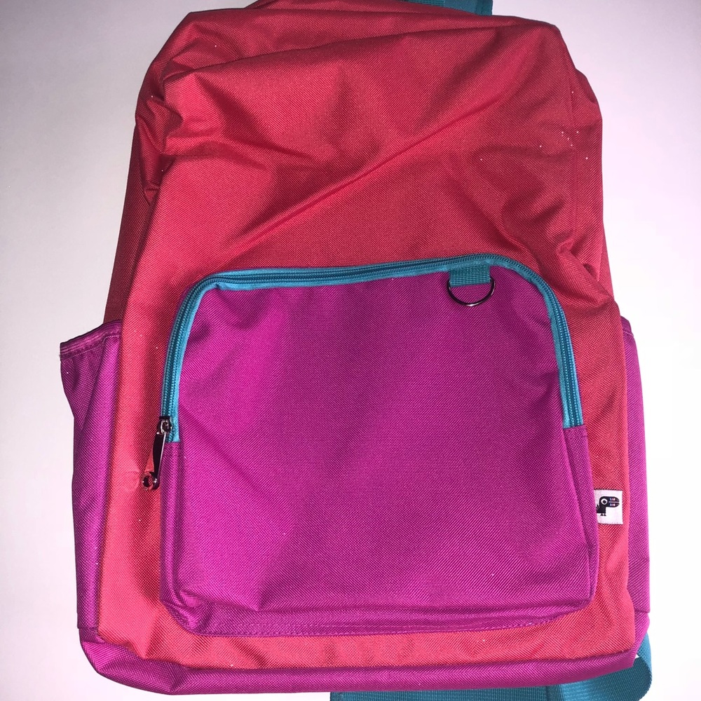 Orange pink and blue backpack. It is a great size with a front pocket