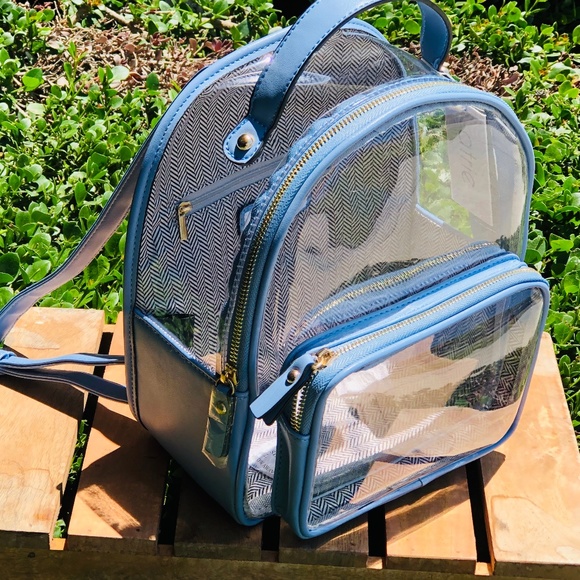 Clear backpack, transparent vinyl with contrasting powder blue vegan leather trim.