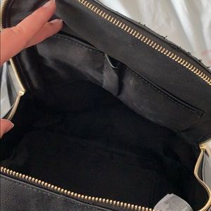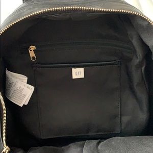 Super cute black backpack! Great for traveling (I used it on my trip to Portugal). Zipper pocket inside as well as three others. Plenty of space to hold water, sweater, or notebooks/folders, sunscreen etc. Has zipper with pocket on outside too as well as a pocket with a button.