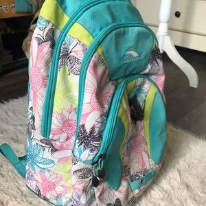 3 compartment Blue and white backpack decorated with flowers and butterflies, includes cup holder