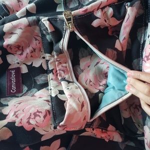 Canvaslove backpack with flower print. One zipper is "stuck" but am sure can be fixed. I just haven't tried as I was still able to use it
