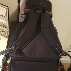 Picnic backpack never used,lots of pockets(top, 2 side, center) bottom is insulated good carry. Top/sides mesh 4 wet gear/clothes etc. Navy blue/ brown accent. NWOT never used. Great gift!