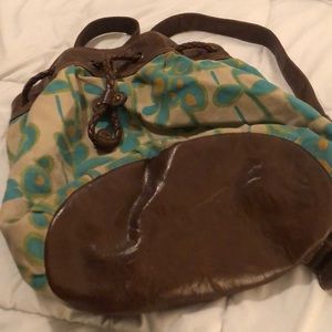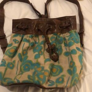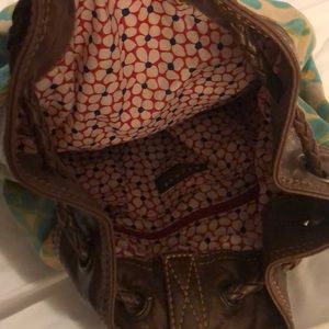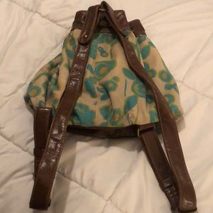 Backpack with drawstring style close and adjustable straps. Inside zipper pocket as well as 2 additional pockets. Material is faux leather and canvas. Colors are brown,cream, blue, green, yellow