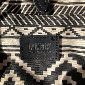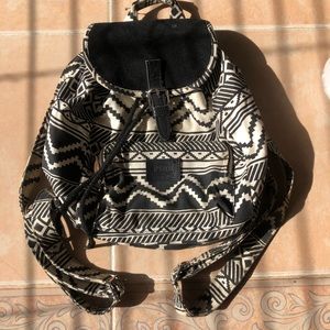Small Victoria secret black tribal print backpack. It cinches and magnate snaps close and has an extra small front pocket.