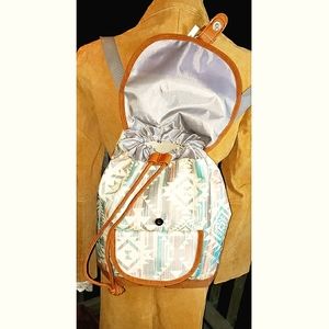 Pull cords to close and flap snaps over that. Has and outside pocket, velcro closed. Adj ustable sholder straps..